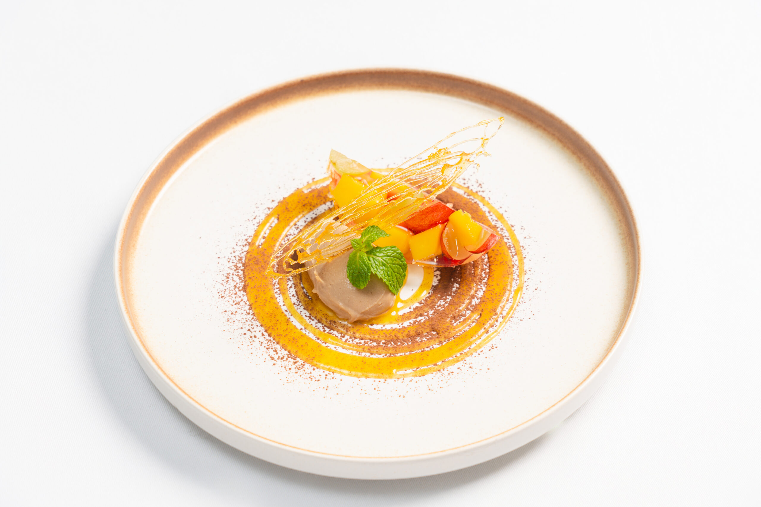 Bitter palm sugar cream paired with a crystal-clear, jewel-like fruit terrine
